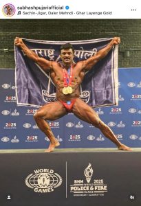 মুম্বই, জুলাই ২০২৫ — নবি মুম্বইয়ের গর্ব, পুলিশ ইন্সপেক্টর  সুভাষ পুজারি যুক্তরাষ্ট্রের বার্মিংহ্যাম, আলাবামায় অনুষ্ঠিত বিশ্ব পুলিশ ফায়ার গেমস ২০২৫ থেকে দুটি সোনার পদক জিতে দেশের মুখ উজ্জ্বল করলেন। বিশ্বের ৭৬টিরও বেশি দেশের প্রতিযোগীদের সঙ্গে প্রতিদ্বন্দ্বিতা করে, তিনি বডিবিল্ডিং (১৭২ সেমি উচ্চতা বিভাগ)মেন’ফিজিক ক্যাটাগরিতে সোনা জয় করেছেন।